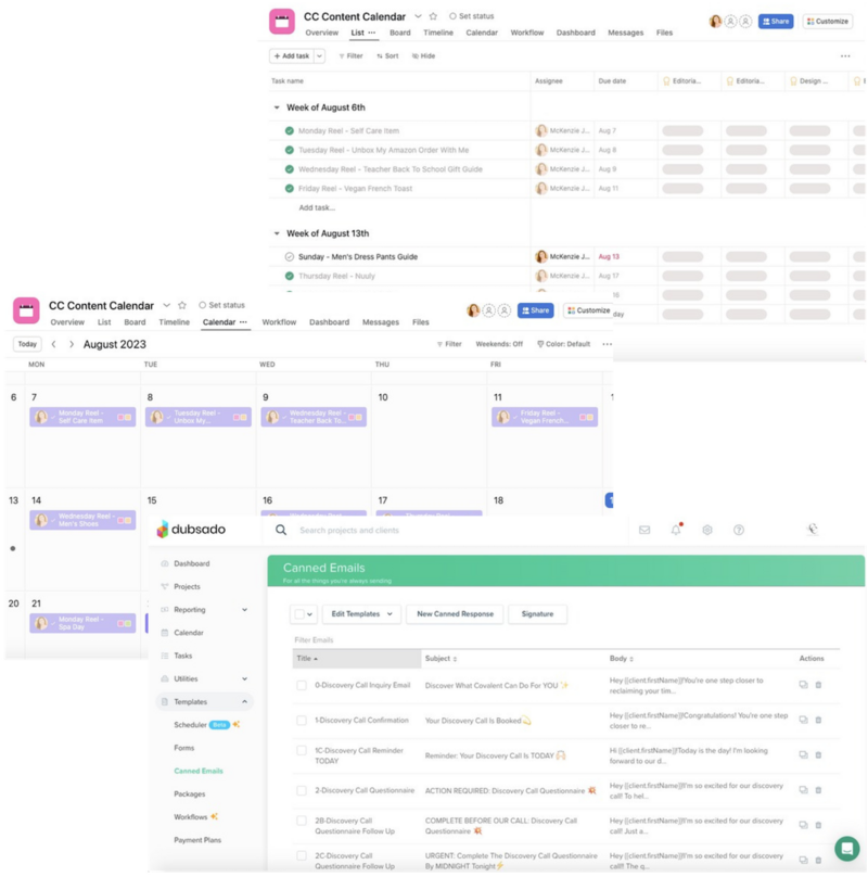 Backend business organization including calendar organization, content calendar creation, use of project management platforms (e.g. Asana, Trello, etc), CRM management (e.g. Honeybook, Dubsado, etc..), inbox management, and SO much more!