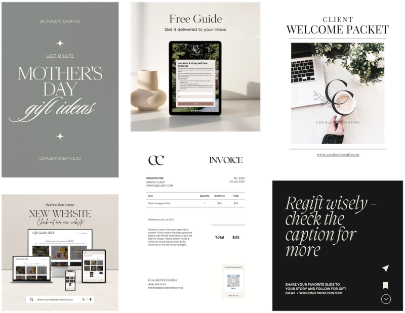 Creation of infographics, proposals, welcome packets, ebooks, checklists, portfolios, social media stories + graphics, thumbnails, flyers, presentations, simple logo creation, customized quotes + invoices, and more!
